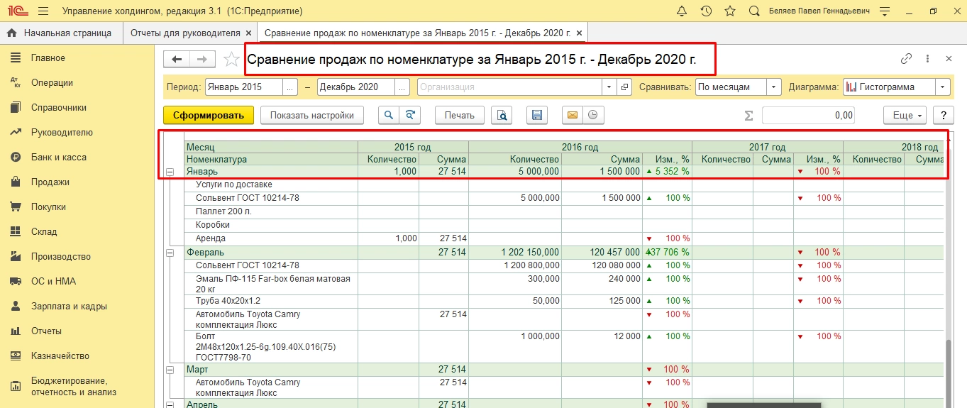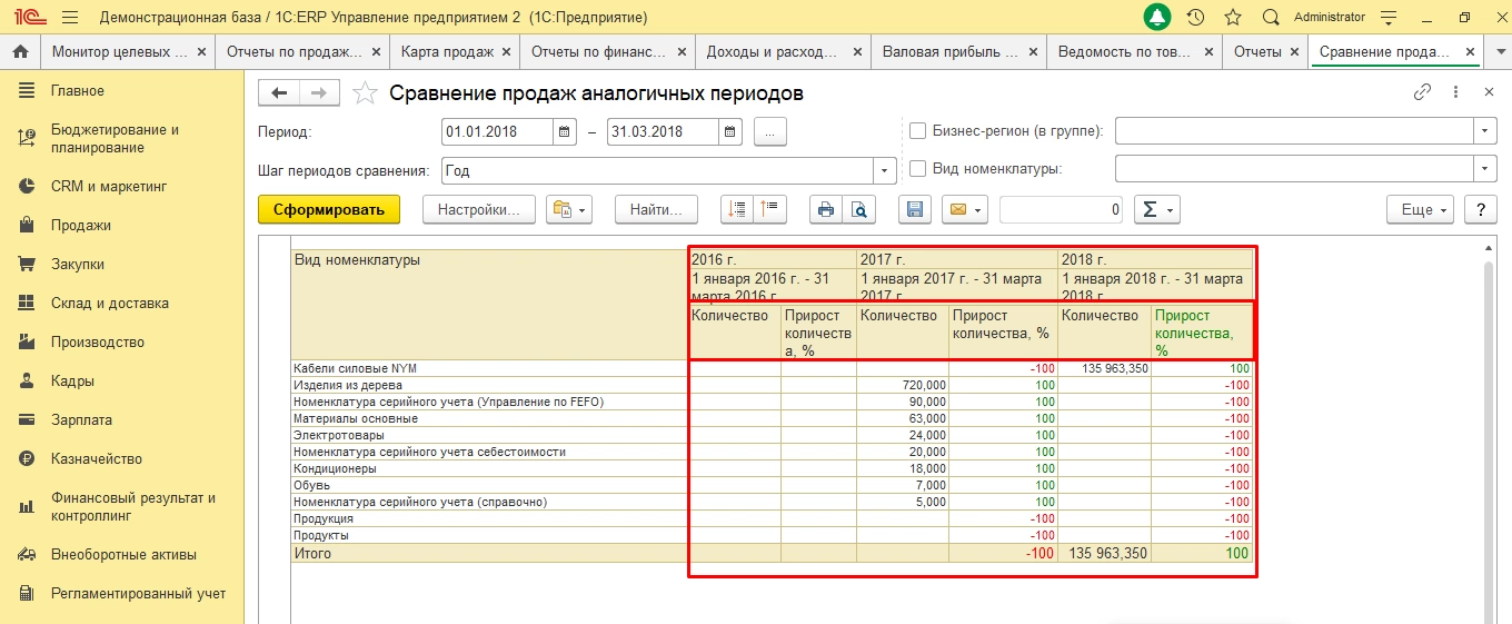 Специализированные программы 1С для учета движения денежных средствНапример, в отчете «Сравнение продаж аналогичных периодов» можно проанализировать по периодам в натуральном выражении объемы продаж товаров (продукции, работ или реализации услуг), а также их прирост в % в сравнении по периодам. Положительные показатели говорят о том, что данный фактор имеет влияние в сторону увеличения прибыли (они зеленые в отчетах), на уменьшение прибыли будут влиять отрицательные показатели (они красные в отчетах).
