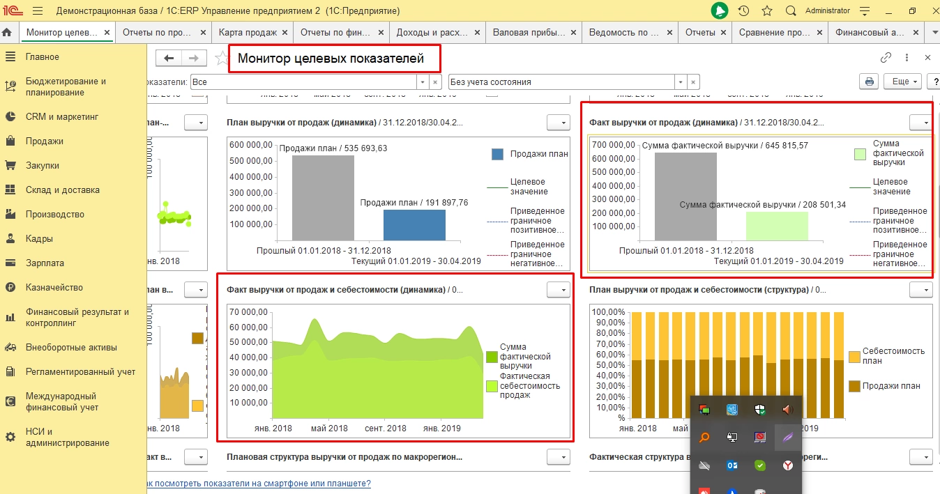 Динамику выручки от продаж и с показателями анализа себестоимости за отчетный и предыдущий периоды (например, за отчетный год) можно посмотреть в отчете «Монитор ключевых показателей». Он наглядно, в диаграммах и графиках, демонстрирует важнейшие факторы влияния, отобранные в зависимости от потребностей пользователя. Отметим, что данные возможности имеются и в новейшем решении – 1С:ERP Управление холдингом, объединившем преимущества рассматриваемых нами продуктов. О его возможностях, также можно прочитать на нашем сайте.