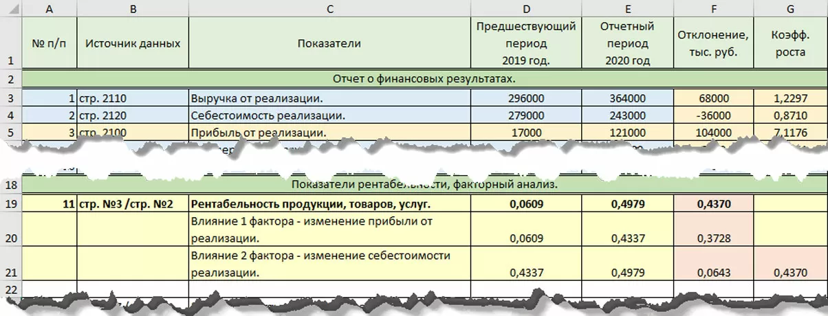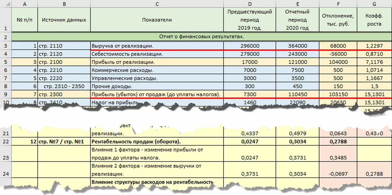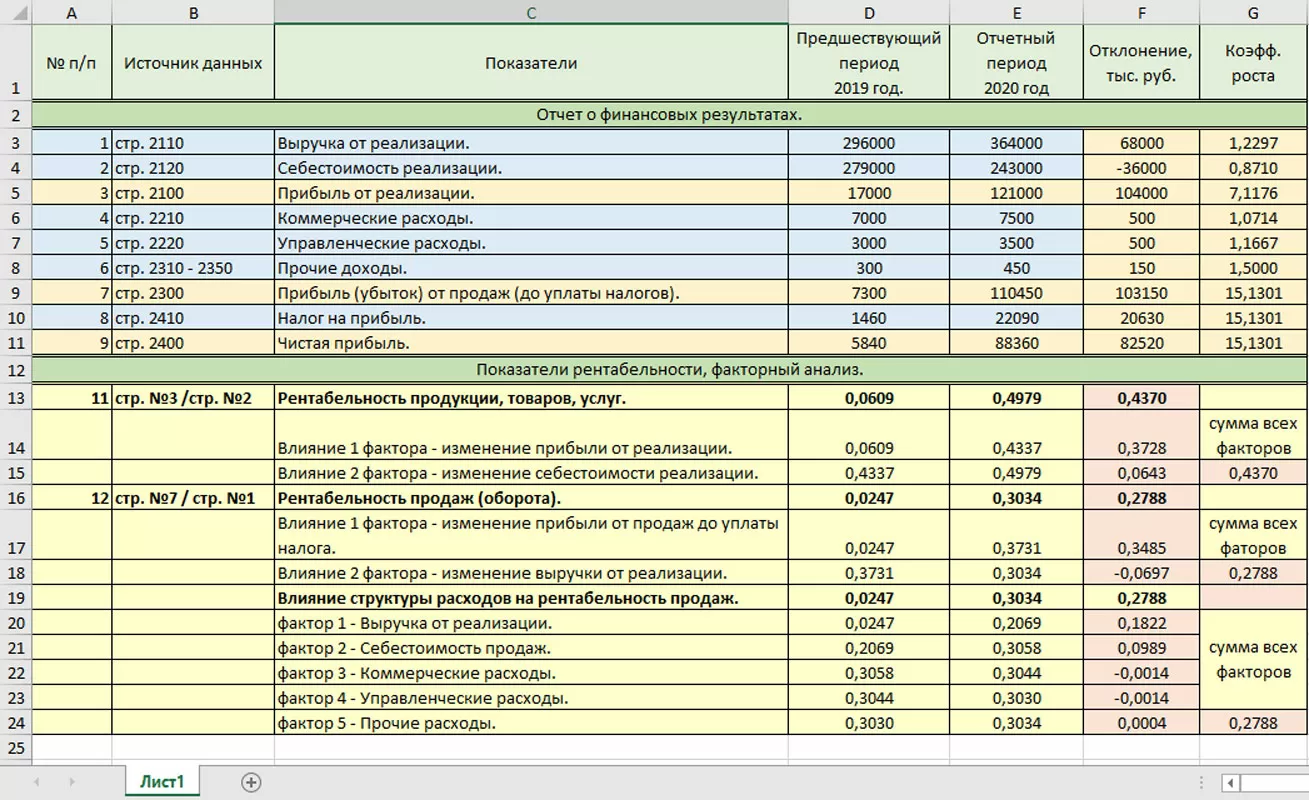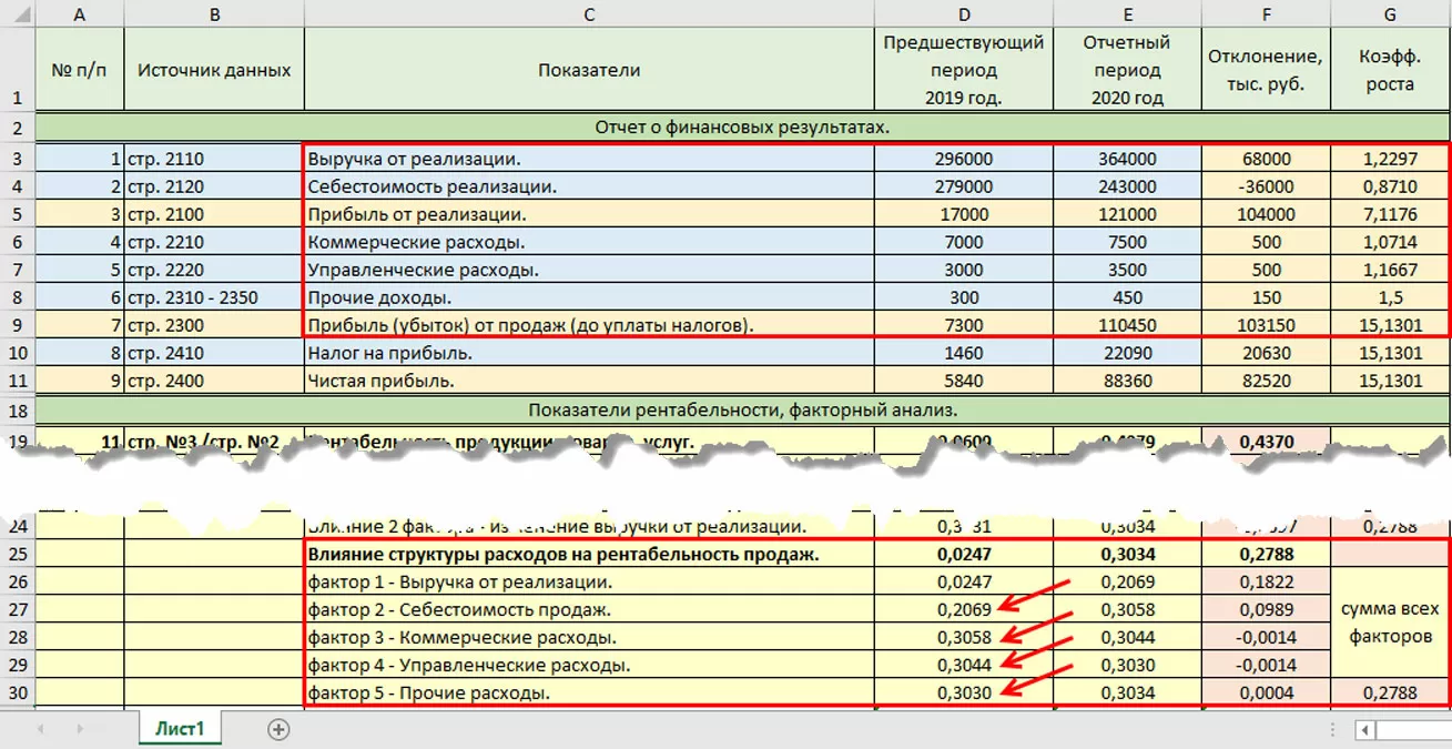 В третьей (розовой) ячейке рассчитывается отклонение показателей с «подменным фактором» – это и есть его влияние. Сумма всех отклонений дает общее отклонение рентабельности продаж, а значение каждого отклонения – это влияние изменения каждого элемента структуры (выручки, себестоимости и т.д.) на общий показатель рентабельности.