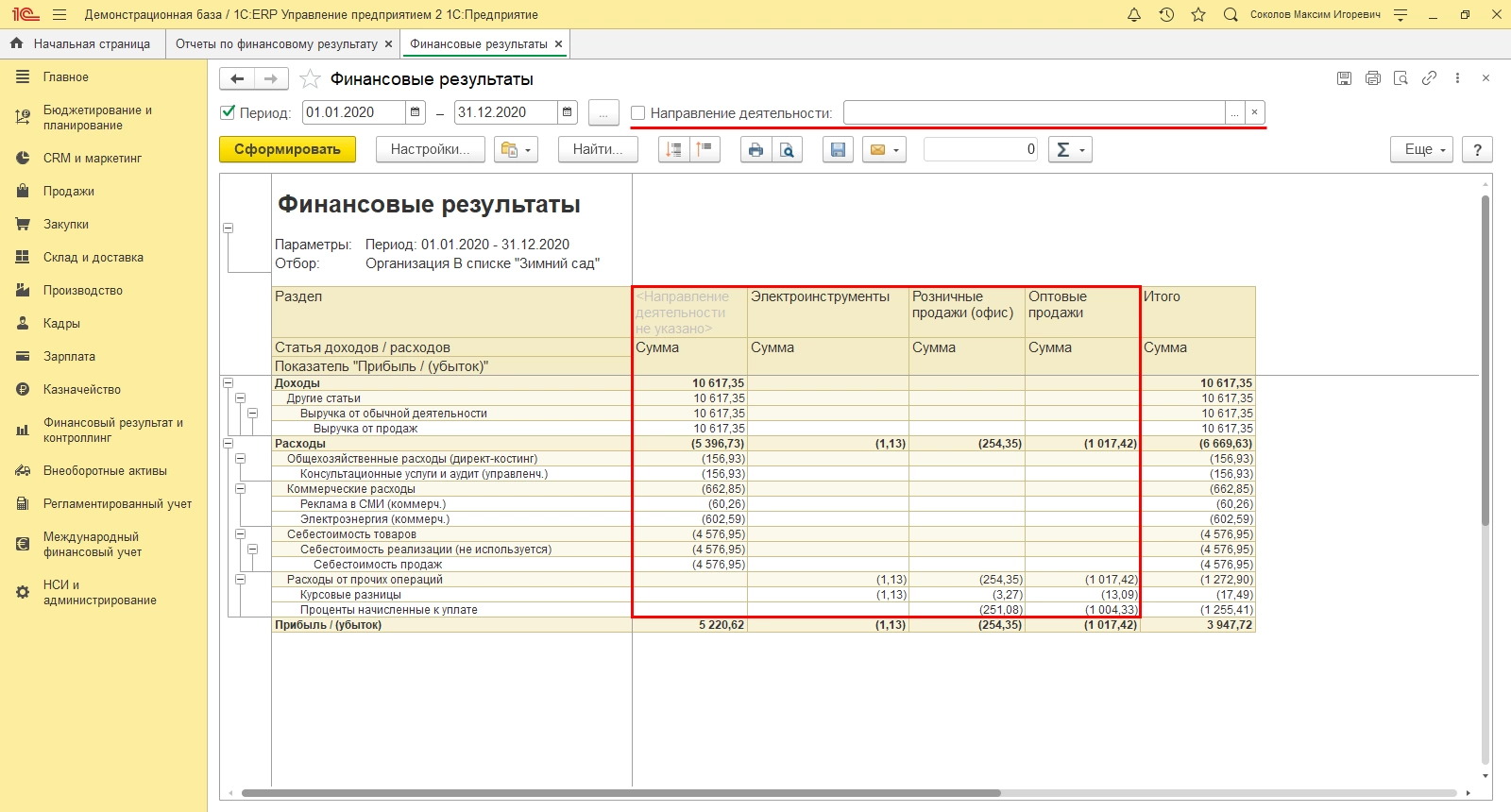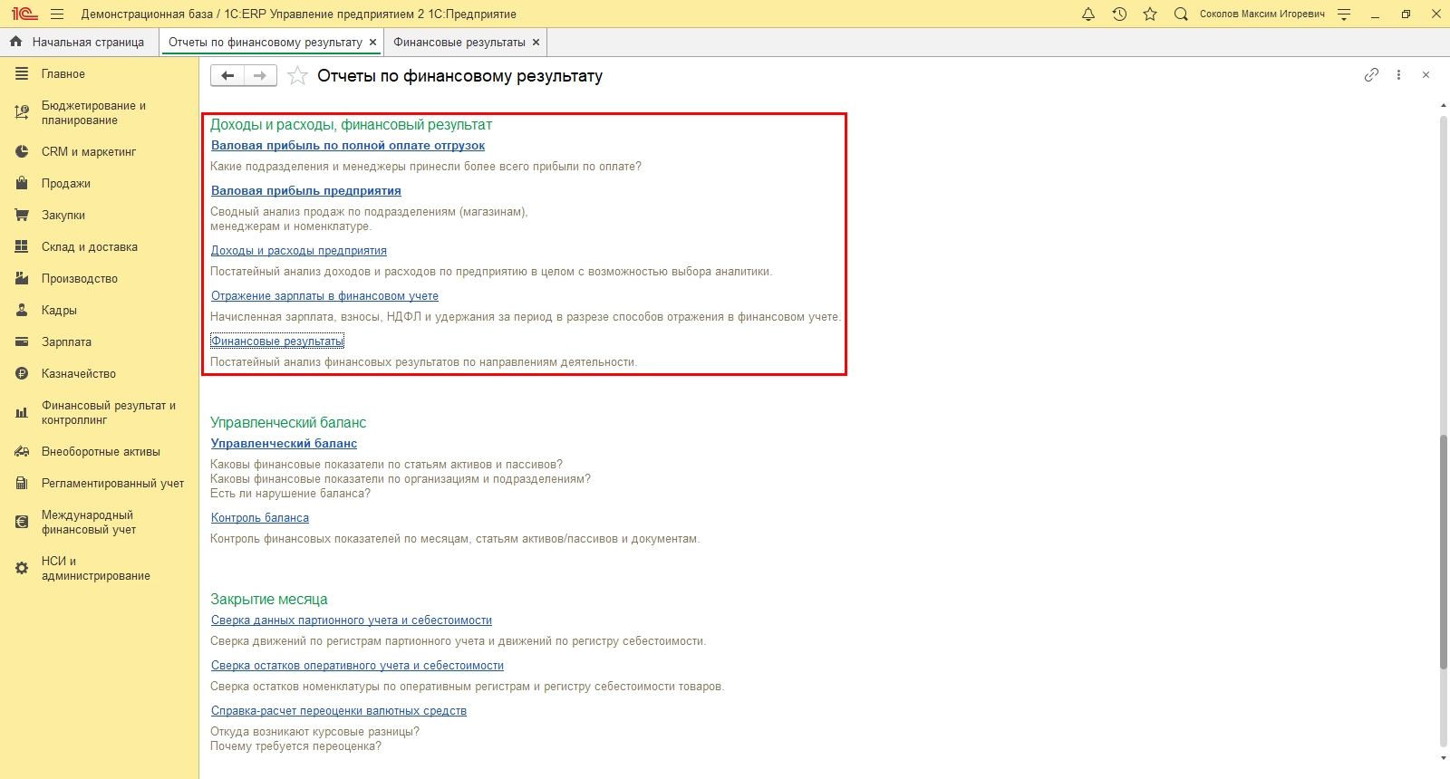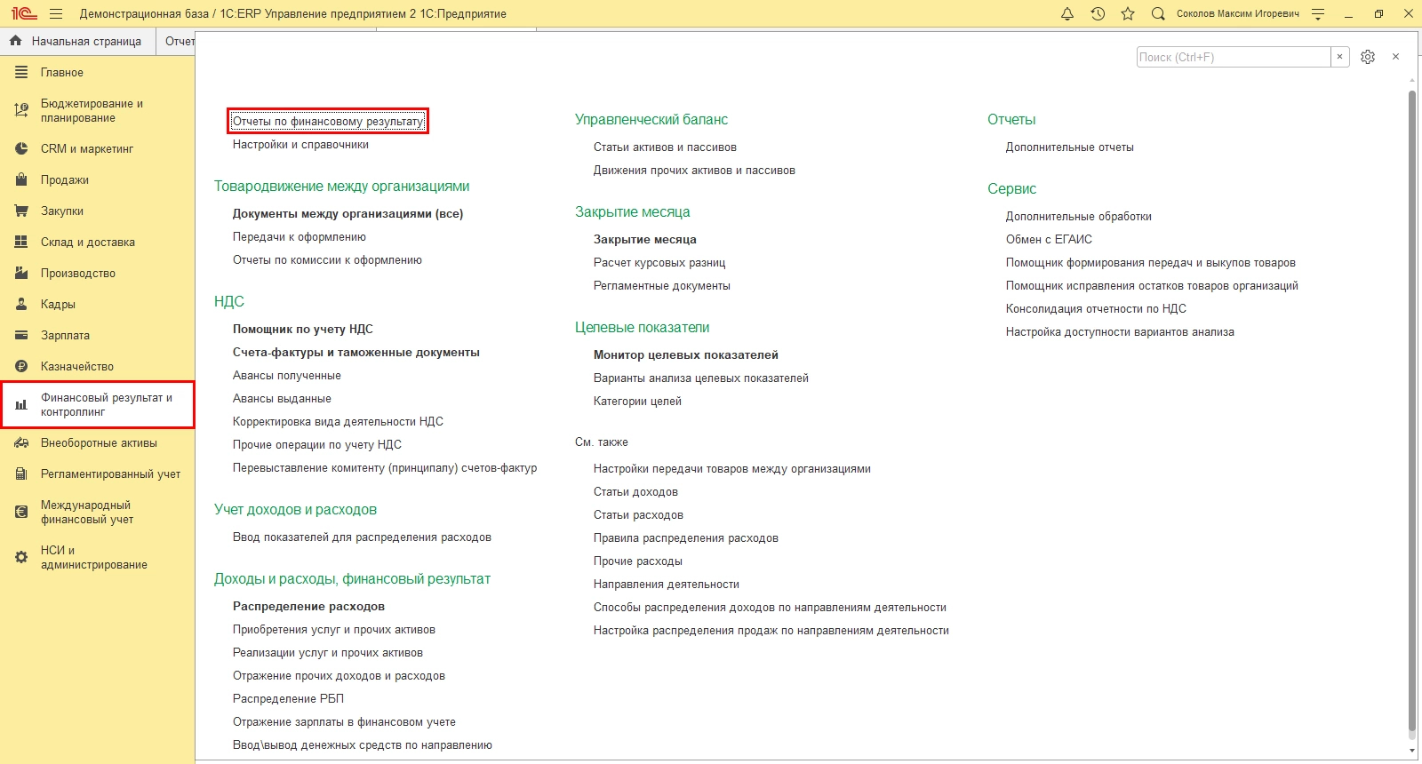 Чтобы получить данные в 1С:ERP, обратимся к разделу «Финансовый результат и контроллинг» - «Отчеты по финансовому результату».