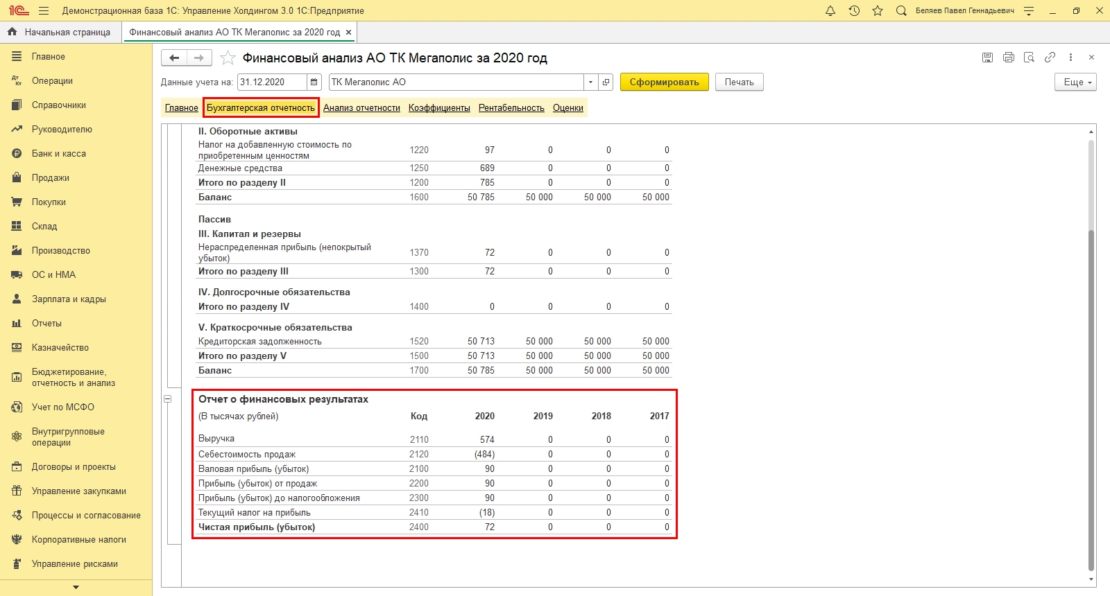 Используя данные таблицы, можно произвести факторный анализ изменения рентабельности. Более детальную информацию по показателям компании пользователь может получить в разделе «Бухгалтерская отчетность», в блоке «Отчет о финансовых результатах».