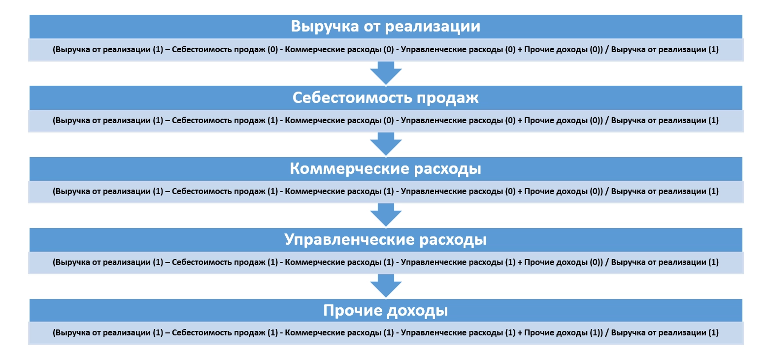 Как видите, суммарное значение отклонений влияния факторов равно общему рассчитанному изменению рентабельности продаж.