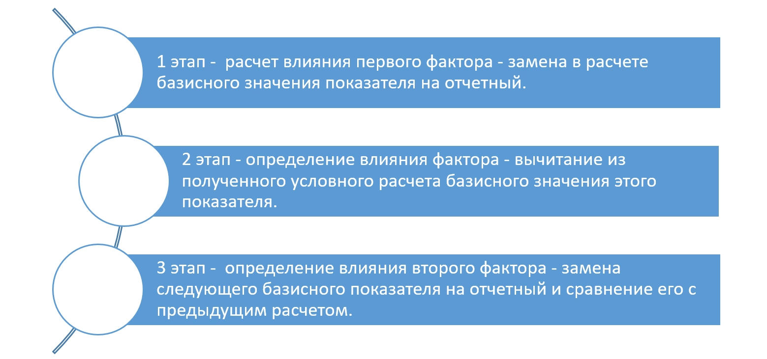 Сам анализ также можно разделить на этапы – последовательность определения влияния факторов.