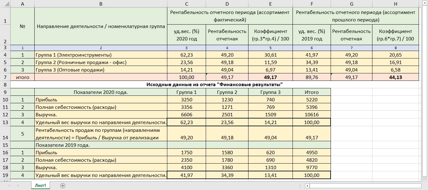 Если посмотреть на данные таблицы, видно, что доля выручки по группам немного изменилась по сравнению с прошлым годом. Как этот фактор повлиял на рентабельность, определим расчетным путем.