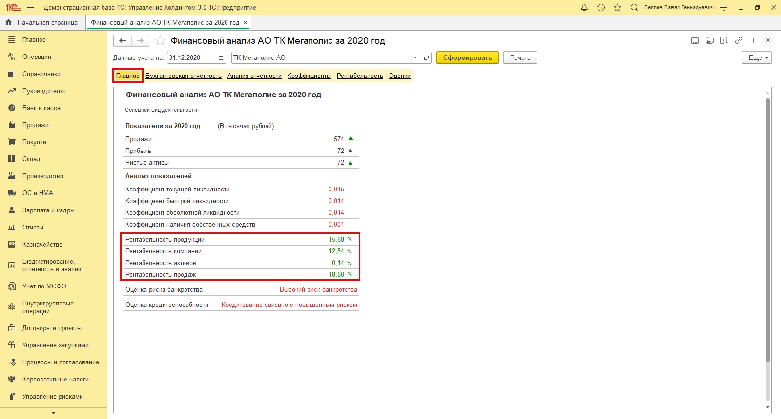 Отчеты и инструменты 1С:ERP и 1С:УХ дают возможность пользователю выбирать информацию о финансовой деятельности и средствах предприятия, группировать данные по периодам, направлениям деятельности и т.п. На основе этих данных имеется возможность оценивать экономическую рентабельность, ориентируясь на различные показатели.