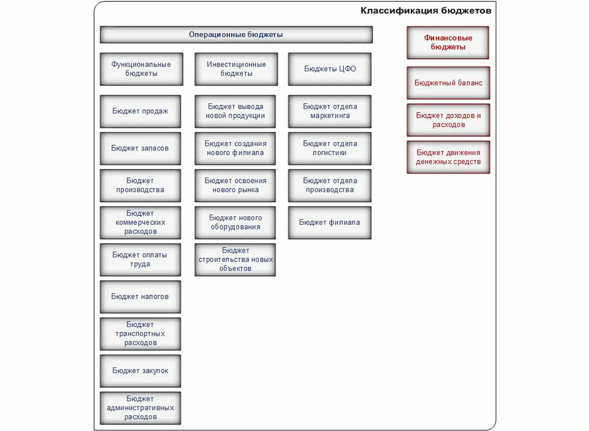 Все бюджеты системы делятся на: операционные (функциональные, инвестиционные, бюджеты ЦФО) и финансовые.