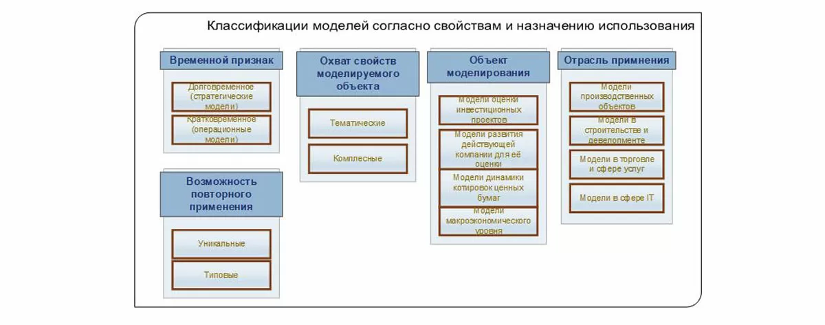Существует много вариантов построения фин. моделей. Их наполнение зависит от многих факторов: целей проекта, масштаба, типа инвесторов, сферы деятельности, стадии проекта, и т.д. Большинство классификаций группируют их на основании временных признаков, свойств моделируемых объектов, отраслей применения и т.п.