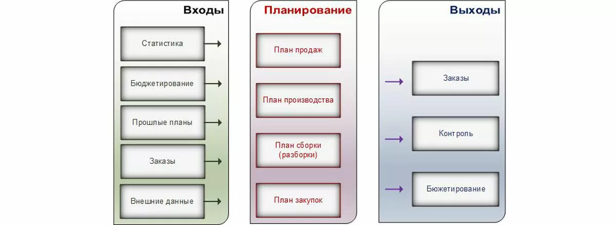 Источники данных блока «Бюджетирования» представлены инструментарием операционного и оперативного (объемно-календарного) планирования. Последнее использует на входе фактические показатели учета, оперативные планы продаж, закупок, на производство и т.д. прошлых периодов, а также информацию по заказам и планы бюджетирования. На выходе планирование формирует заказы для исполнения, а также заполненные данные планов в статьи бюджетов, и обеспечивает инструментарий контроля и анализа через план-факт.