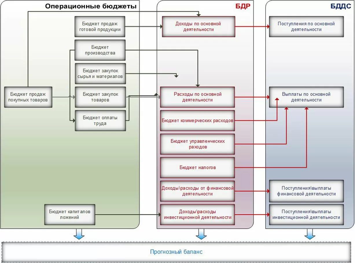 Итоговые или мастер-бюджеты (уровень стратегического планирования) любого предприятия – БДР и БДДС, и операционные бюджеты строятся на основании данных предоставленных бюджетами нижестоящих уровней. Причем часть операционных бюджетов входит в БДР в виде статей, влияя в итоге на денежные потоки и БДДС. И уже на основании данных мастер-бюджетов происходить построение прогнозного баланса.