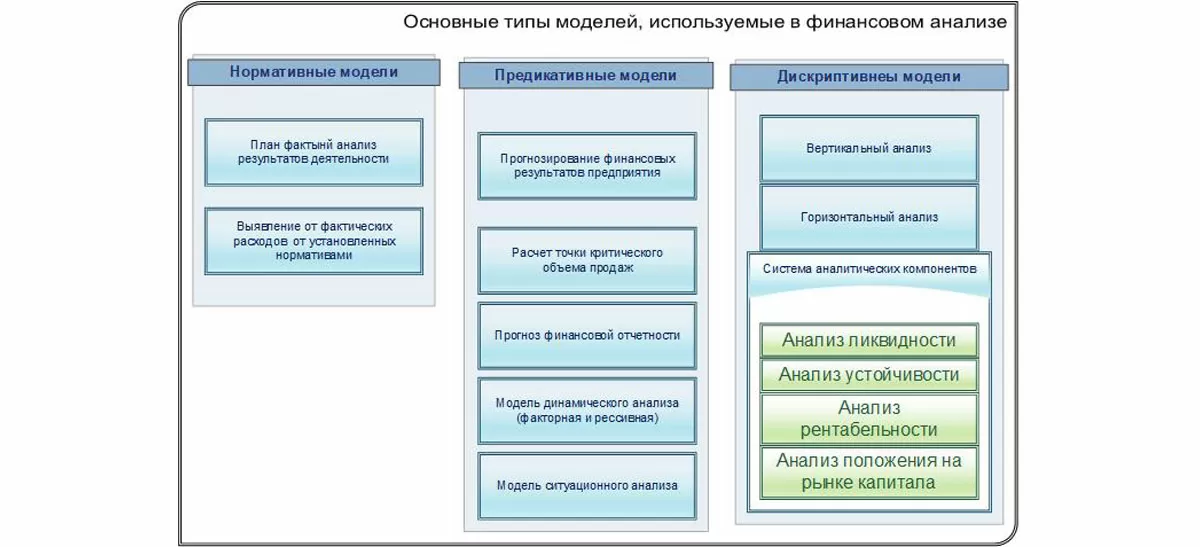 Еще один вариант группировки опирается на метод финанализа. Для каждой группировки характерны свои способы анализа бизнес-процессов предприятия. Наиболее часто берут нормативные, предикативные и дескриптивные модели.