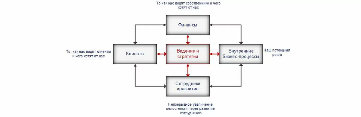 Согласно теории, все цели делят на четыре перспективы: финансы, внутренние бизнес-процессы, клиенты, сотрудники и развитие. Исходя из целей предприятия, количество составляющих может быть увеличено. Предполагается, что все цели компании и показатели перспектив связаны между собой и работают одновременно.