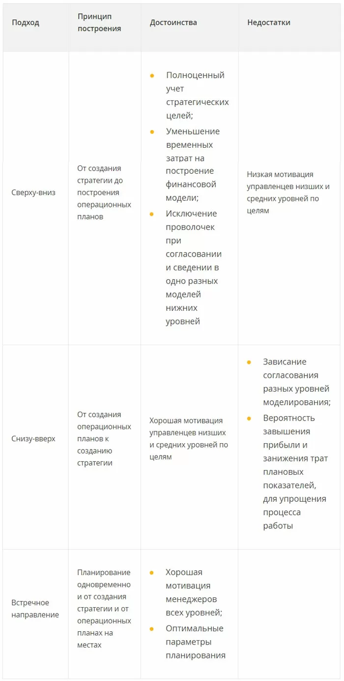 Существует несколько методик построения финансовых моделей. Принцип построения методики зависит от выбора направления движения в иерархии уровней планирования. Для получения комплексных моделей необходима разработка системы взаимосвязанных моделей для всех уровней планирования от стратегического до операционного или наоборот. Выделяют следующие варианты процесса построения модели: