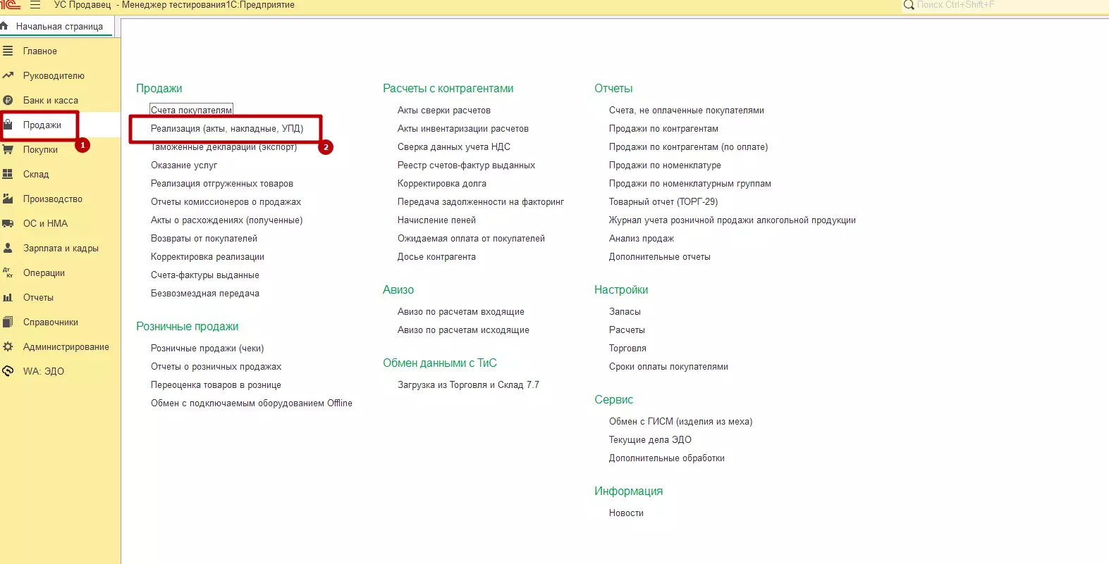 - Открыть раздел с документами Реализации. Для этого в информационной базе 1С мы открываем раздел Продажи и переходим на вкладку Реализация (акты, накладные, УПД).