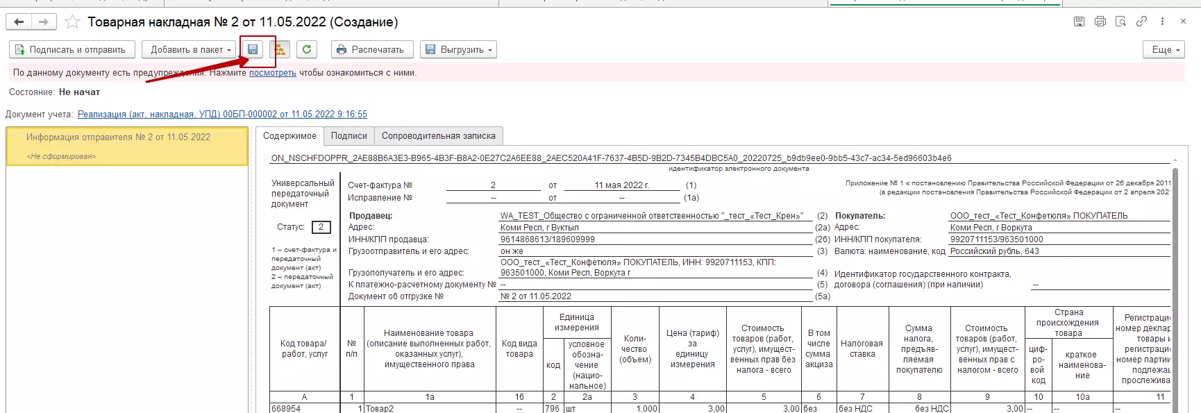 В открывшейся форме УПД для сохранения документа необходимо нажать на Дискету.