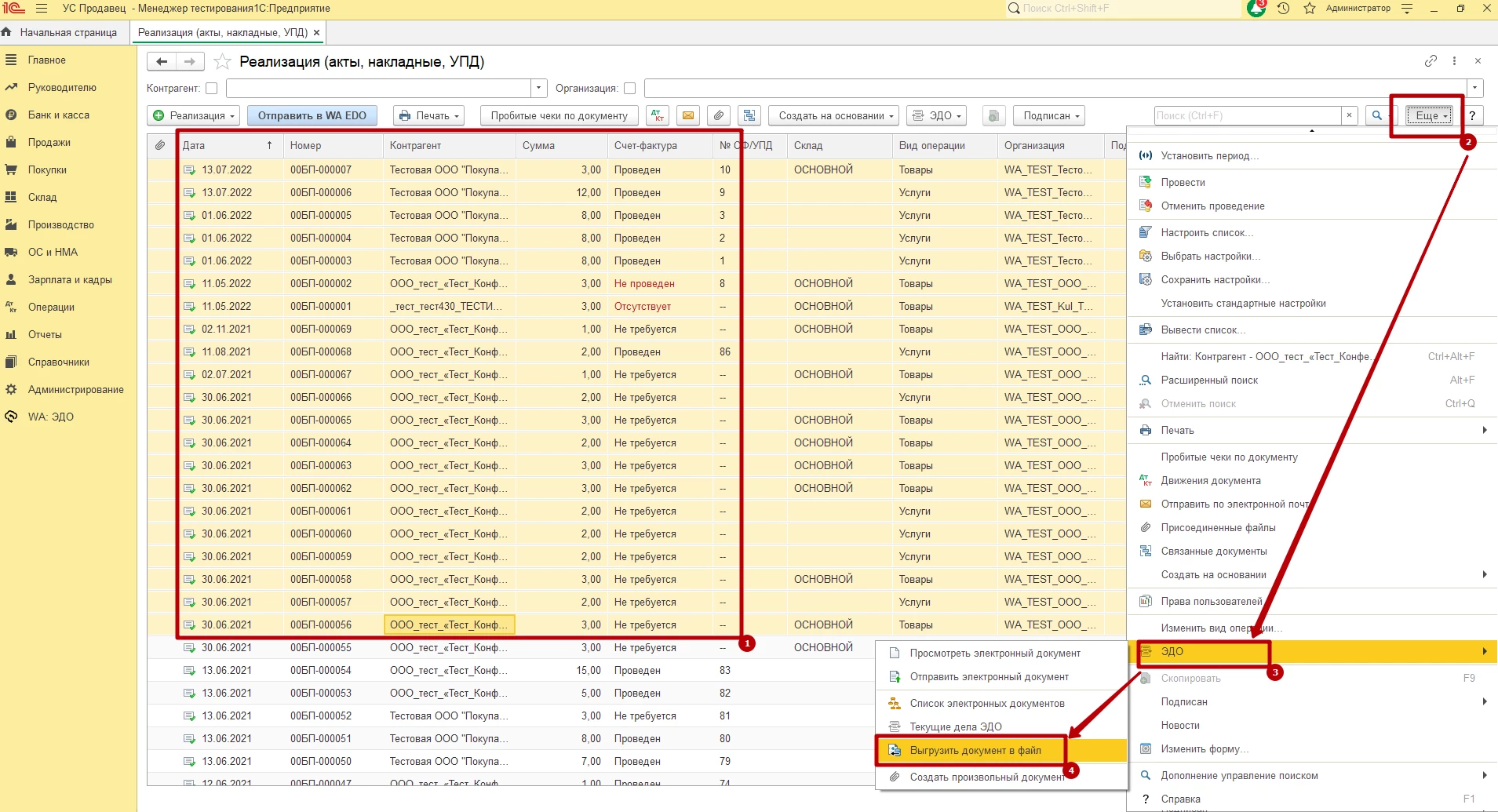 Выгрузка УПД в формате XML из списка РТУ при подключенном сервисе 1С-ЭДО