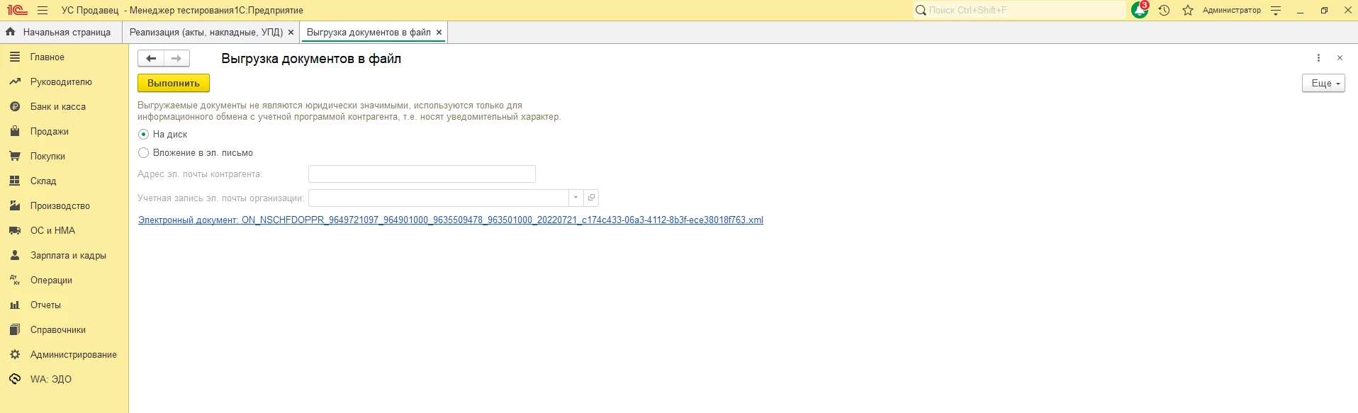 Чтобы выгрузить файл XML УПД из 1С, необходимо: