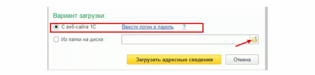 - Выбрать вариант загрузки, предлагаемый программой: с веб-сайта 1С или из папки на диске. Если выбрана загрузка с сайта 1С, то программа предлагает ввести логин и пароль (если он у вас есть).