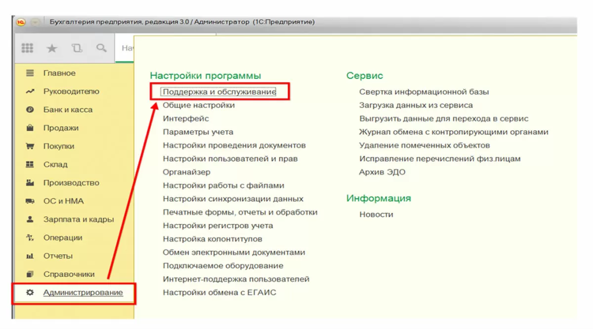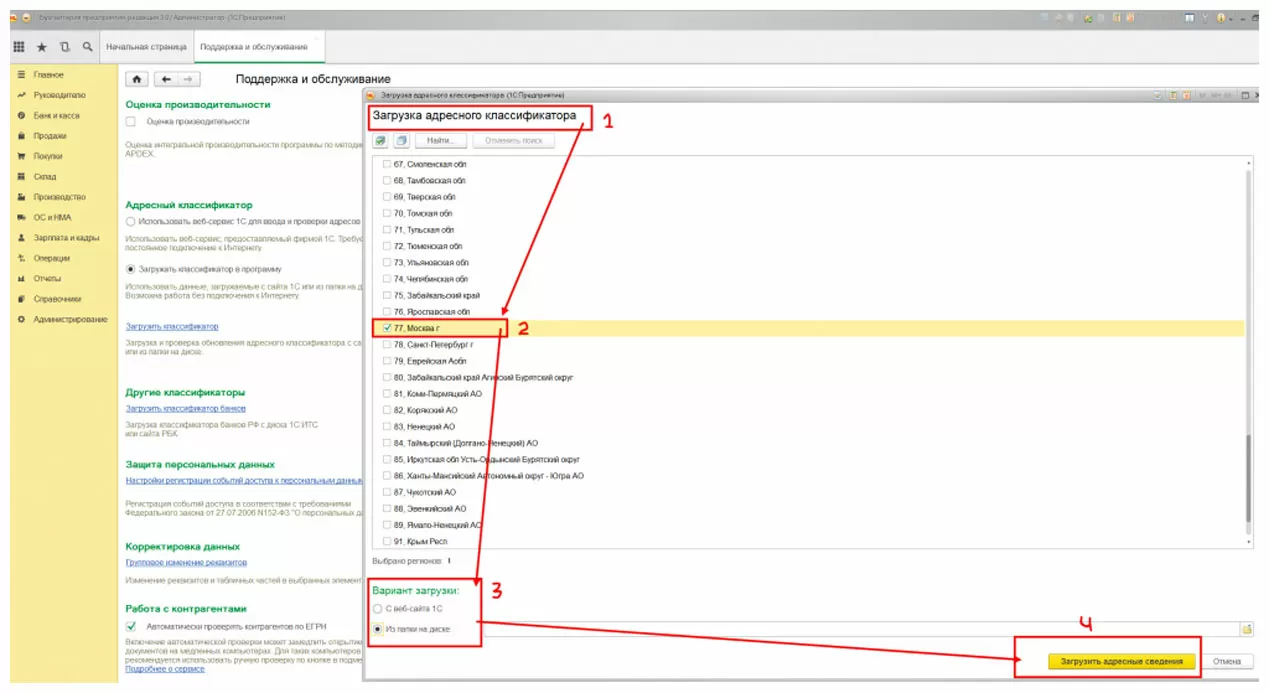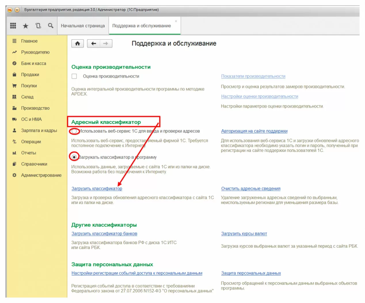 Нажатие на вкладку, откроет на экране меню раздела. Заходим в раздел «Поддержка и обслуживание», нажав правой клавишей мыши на подпункт меню, мы переходим в справочную систему настройки программы, где находим пункт «Адресный классификатор». Классификатор можно загружать двумя разными способами, которые нам предлагает программа: