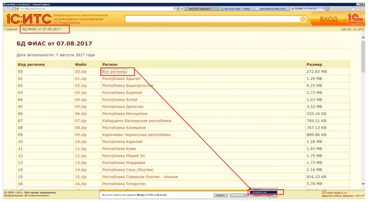 Для этого надо зайти на сайт. Перед вами на экране откроется актуальная база данных ФИАС. Выбираете или все регионы (код 00), или только отдельный нужный регион. Нажимаете на ссылку «Все регионы» и программа предложит сохранение на компьютере. Выбираете нужный диск и папку и сохраняете предложенный файл.