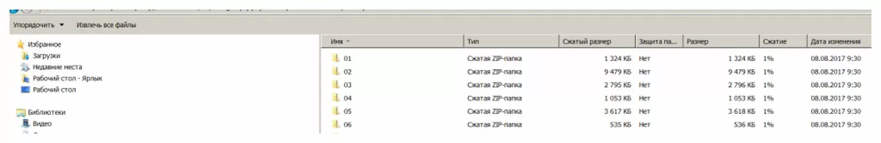 Если зайти в папку, мы увидим заархивированные файлы, которые потом можно будет загрузить в программу 1С. Инструкцию по загрузке описана ниже.