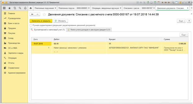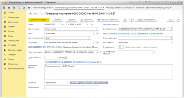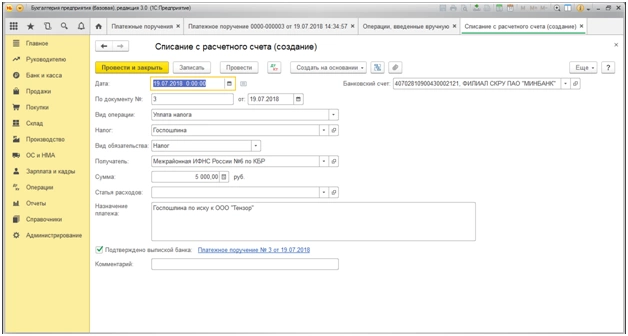 Далее нажимаем кнопку «Провести и закрыть». После выгрузки платежного поручения и получения выписки банка с подтверждением списания денежных средств, уплата госпошлины осуществлена.