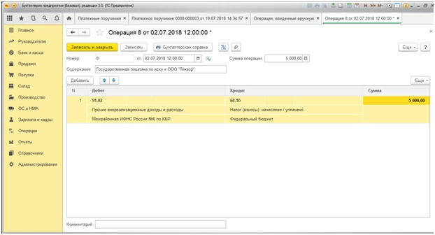 В создаваемом документе вводим номер и дату приказа, выбираем бухгалтерскую проводку Дт 91.2 - Кт 68.10 (счет госпошлины в 1С это 68.10, пошлина же относится к категории прочих расходов, поэтому используем счет 91.02 «Прочие доходы и расходы»), вводим сумму государственной пошлины 5,0 тыс. рублей.