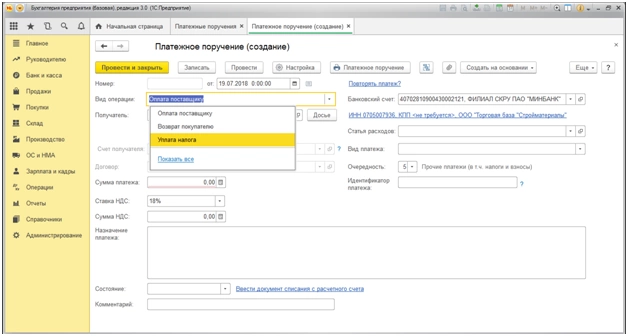 В открывшемся окне платежного поручения выбираем вид операции «Уплата налога». Это необходимо чтобы система сформировала платежное поручение с активными полями 104-110.