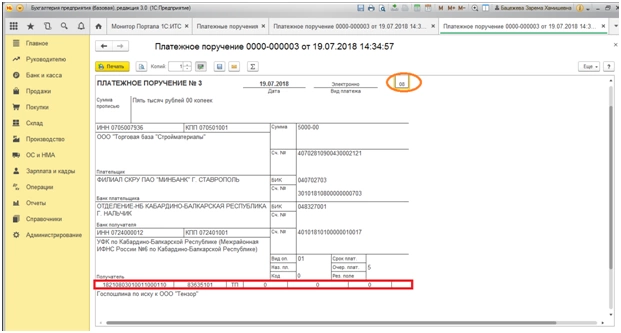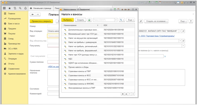 Так как первые три цифры Кода бюджетной классификации (в соответствии с приказом Минфина России 65-н) говорят об администраторе дохода, в нашем случае это 182 «Федеральная налоговая служба». Программа автоматически установила доходный счет бюджета и получателя платежа – Территориальный орган налоговой инспекции.