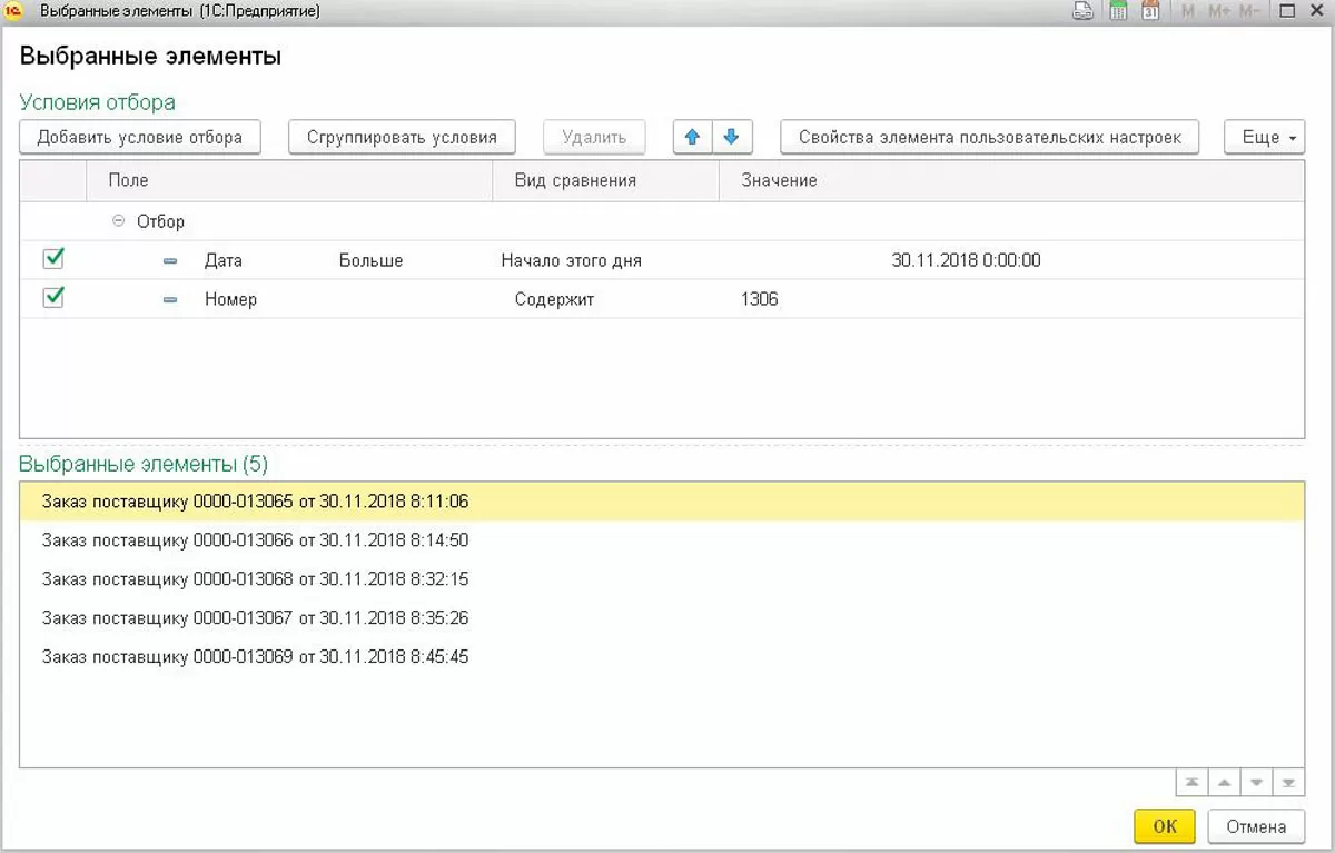 После подтверждения групповая обработка подгрузит все реквизиты элементов выбранных видов. Но нам нужно менять не все документы, так как их может быть много – сотни или тысячи. Нам необходимо отобрать из них несколько по определенным условиям. Для этого нужно нажать на кнопку «Добавить условие отбора», чтобы открылась еще одна форма, похожая на форму настройки отчета.