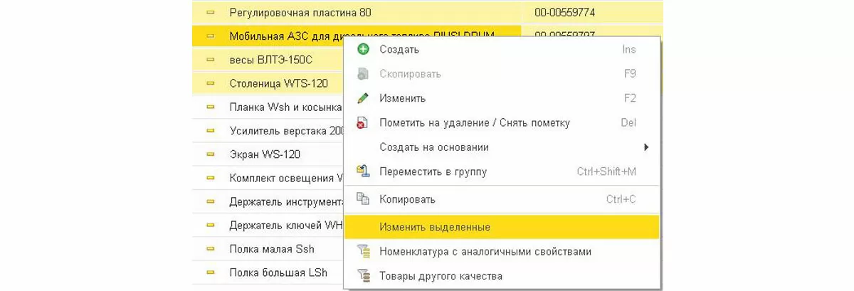 Один из самых простых способов поменять значение нескольких реквизитов – воспользоваться функцией «Изменить выделенные» в форме списка объектов. Разработчики 1С предусмотрели эту возможность, и странно было бы ею пренебрегать. Она отлично подойдет для редактирования нескольких документов или элементов справочника. Рассмотрим, как это сделать на простом примере: