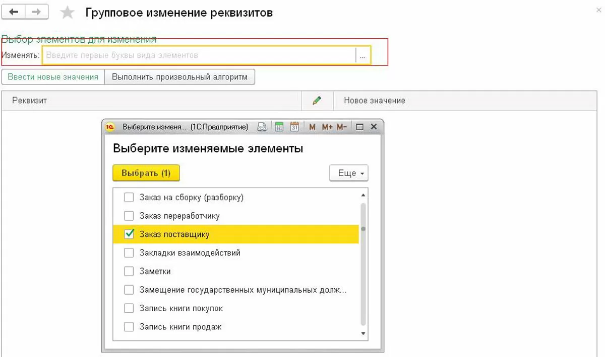 Неподготовленному пользователю интерфейс данного механизма может показаться сложным. Но когда вы начнете разбираться – вы поймете, что все просто и эффективно. В первую очередь, необходимо отобрать нужные нам документы или справочники в конфигурации. В разделе «Выбор элементов для изменения» выберите нужные типы объектов – возможен единственный или множественный выбор.