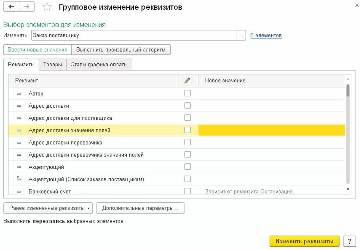 После того как итоговый перечень документов или элементов справочника готов, нажмите «ОК». Теперь остается только выбрать, какие реквизиты в объектах и их табличных частях нужно изменить. Если нужно сделать групповую обработку в 1С для изменения с одного значения на другое, то подойдет режим «Ввести новые значения». Отмечаем галками реквизиты для изменения и задаем новые значения в столбце «Новое значение» и подтверждаем.