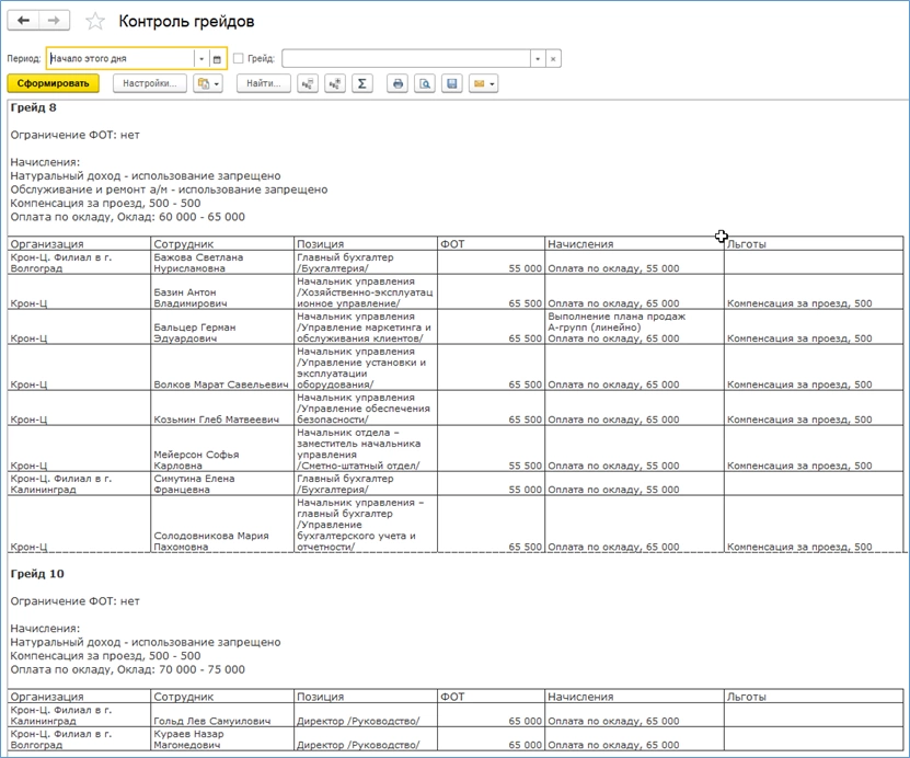 Отчет «Контроль грейдов» показывает мотивацию сотрудников в зависимости от грейда в виде таблицы.