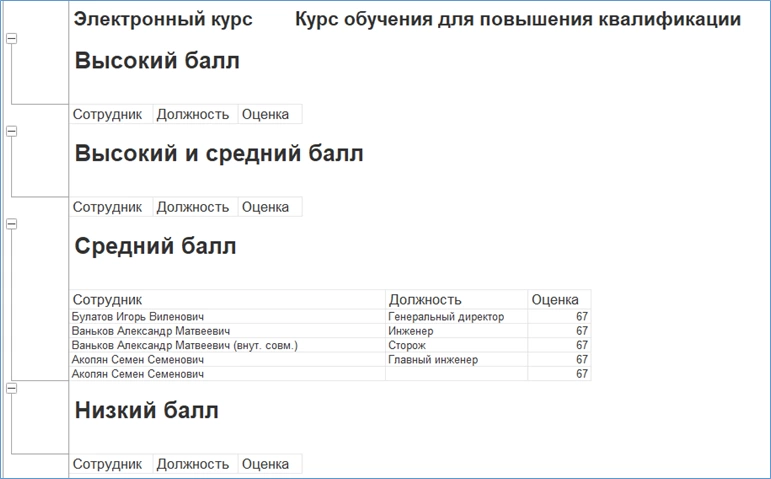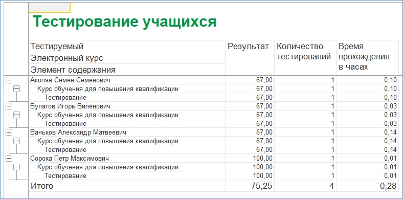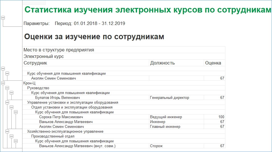 В отчете «Изучение электронных курсов (по сотрудникам)» можно проследить «успехи» сотрудников, прошедших электронное обучение.