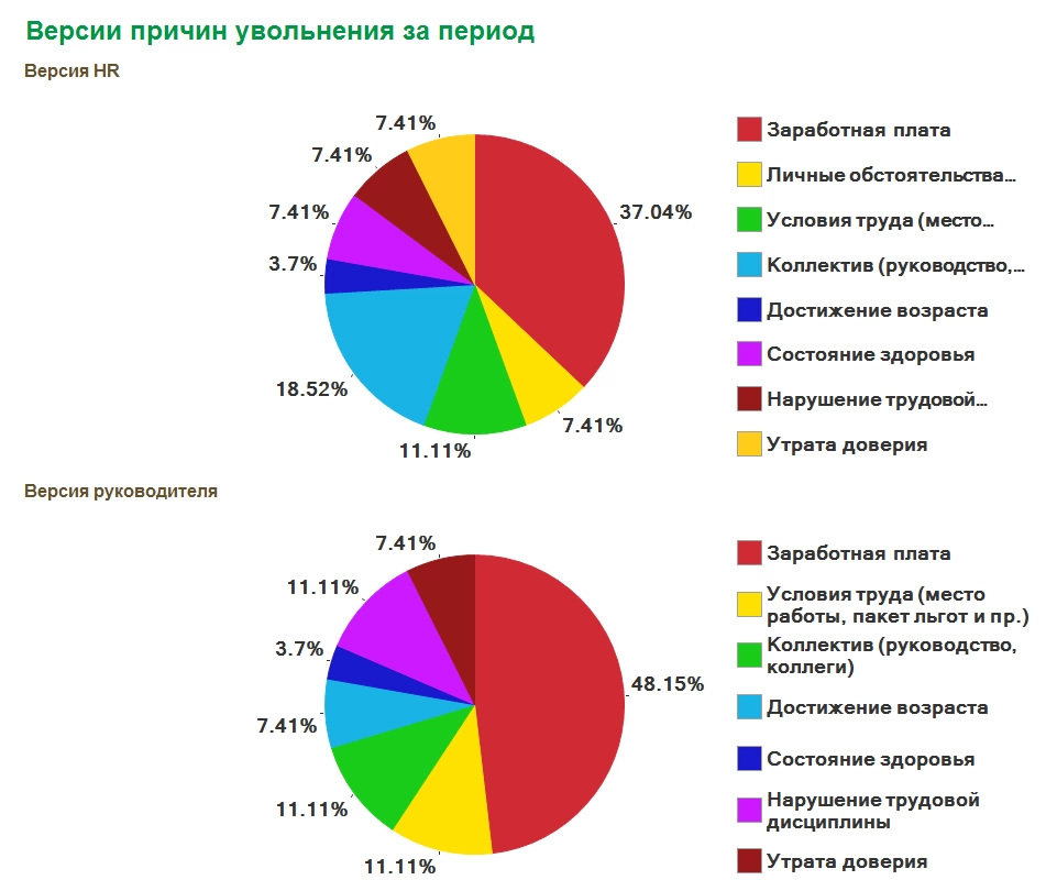 Причины увольнения анализирует отчет «Версии причин увольнений за период».