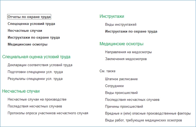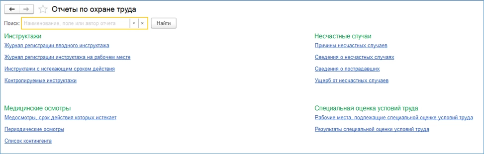 По охране труда также имеется множество отчетов. Полный их список показан ниже: