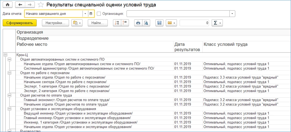 Для того чтобы увидеть весь список отчетов, нужно включить соответствующий функционал в настройке (раздел «Охрана труда»). В качестве образца приведем отчет по результатам спецоценки условий труда.