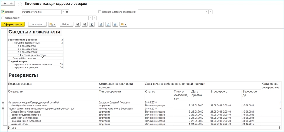 Отчетов на эту тему немного, но они достаточно информативны. В отчете «Ключевые позиции кадрового резерва» мы видим вместе и позиции штатного расписания, для которых создается резерв, и сотрудников, которые в него входят.