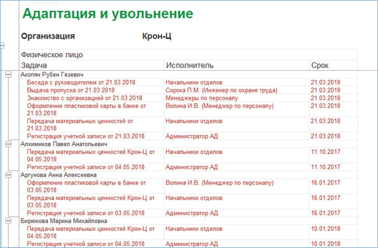 Для контроля процесса адаптации в системе предусмотрен отчет «Сотрудники на адаптации и увольняемые». Отчет располагается в разделе «Отчеты по подбору персонала». Вид отчета показан на рисунке ниже. В отчете красным выделяются критичные задачи – уже просроченные, или задачи, которые должны быть выполнены сегодня.