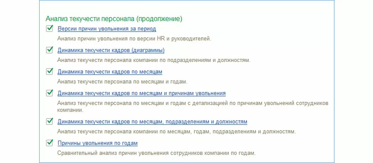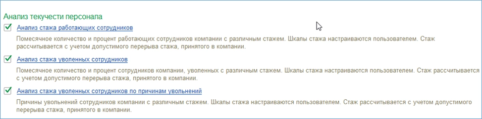 Для анализа причин увольнения служат отчеты из раздела «Анализ текучести персонала». В этом разделе несколько отчетов.