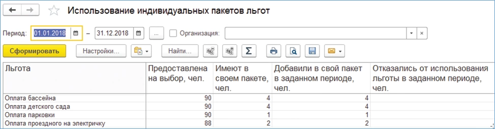 Для анализа востребованности предоставленных сотрудникам в рамках самообслуживания льгот предназначен отчет «Использование индивидуальных пакетов льгот».