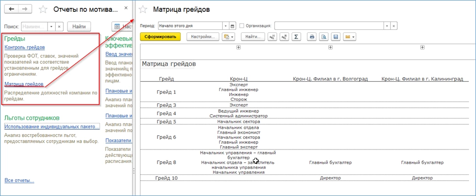 В отчете «Матрица грейдов» отражены льготы по филиалам в зависимости от грейда.
