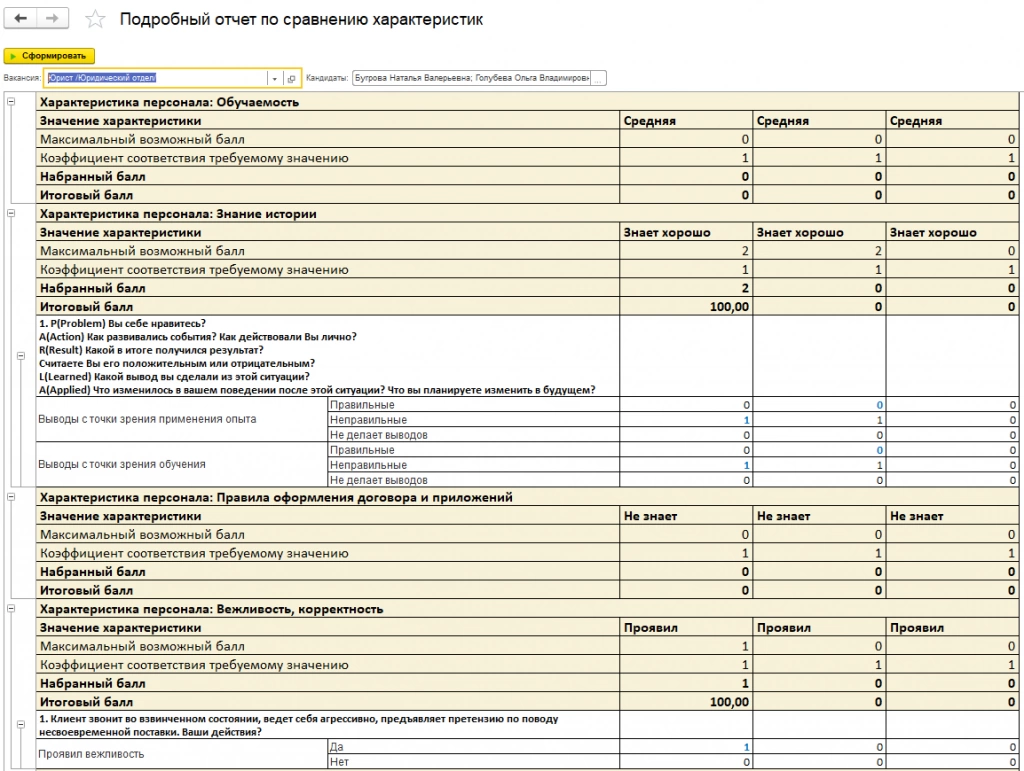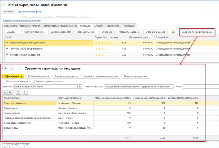 В этом отчете можно получить более подробную расшифровку характеристик кандидатов на прием по кнопке «Подробное сравнение кандидатов».