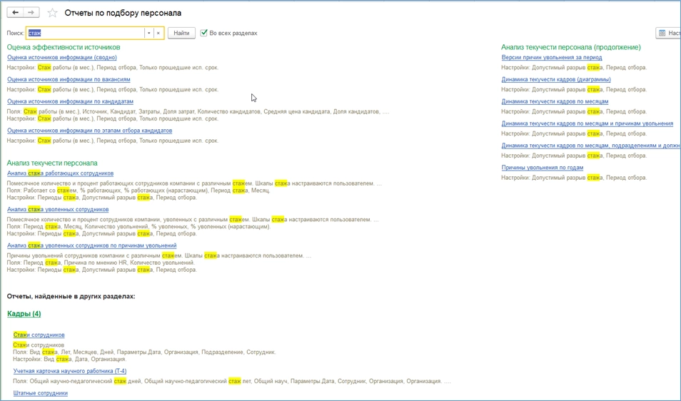 Если войти в раздел отчетности, то мы увидим, что там имеется поиск. Например, нужно найти данные по стажу сотрудников. Для этого наберем слово «стаж» в строке поиска. Программа покажет все отчеты, в которых имеются данные по стажу. При этом будут видны отчеты из всех разделов, а не только из того, в котором задан поиск (при установке флажка «Во всех разделах»).