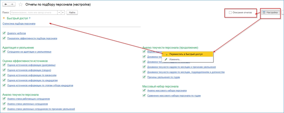 Теперь можно убрать описание отчетов для компактного отображения перечня отчетов (снять соответствующий флажок), а также переместить отчет в «Быстрый доступ». Для этого нужно, встав на отчет, нажать правую кнопку мыши, а затем выбрать пункт «Переместить в быстрый доступ» контекстного меню.