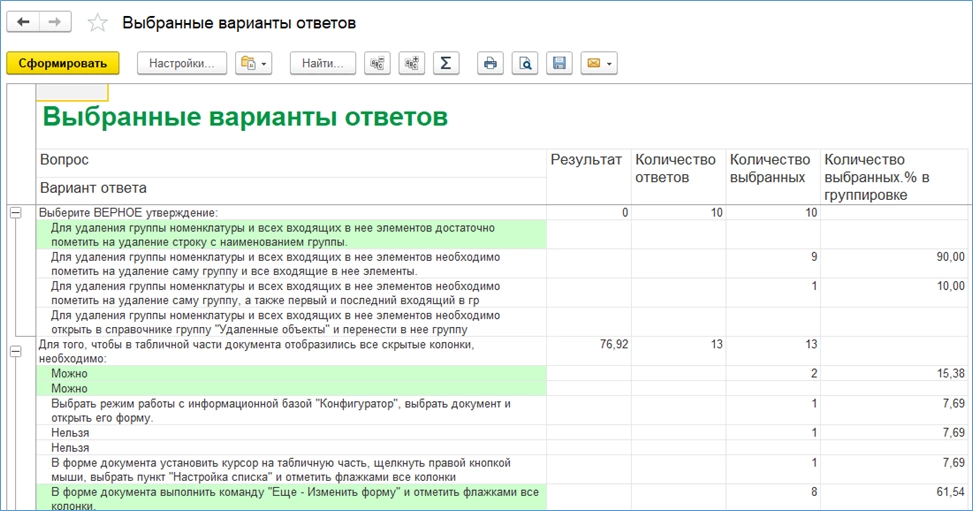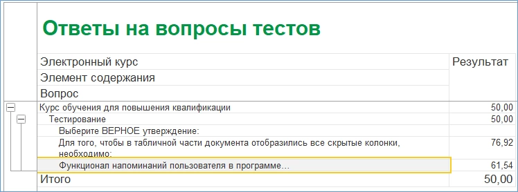 Отчеты можно использовать, чтобы определить, как изменяются знания пользователей во времени, а также для составления рейтинга обучаемых. Отчет «Ответы на вопросы тестов» выявляет самые простые и самые сложные вопросы.