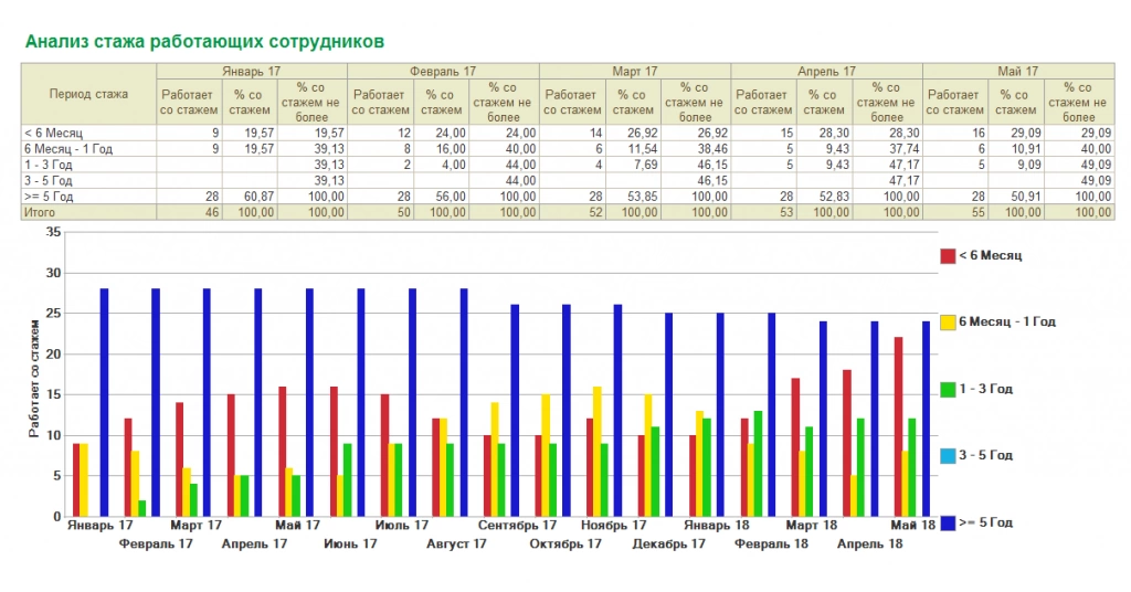 А вот как выглядит отчет «Анализ стажа работающих сотрудников»: