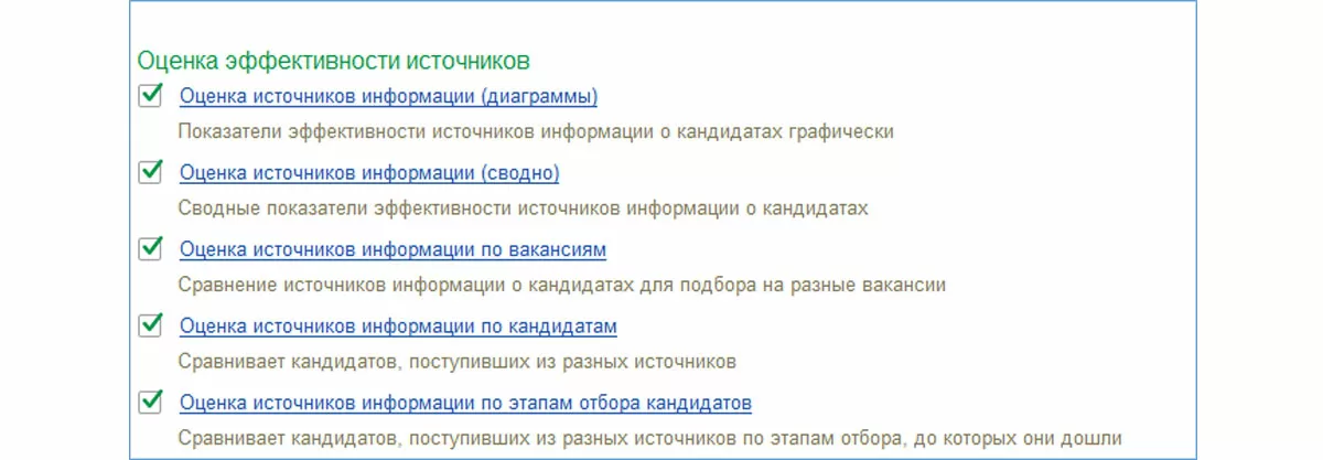 Среди отчетов по подбору персонала имеется целый раздел отчетов по оценке эффективности источников информации о кандидатах. Здесь собраны отчеты, позволяющие оценить затраты на поиск кандидатов по источникам информации. Вот как выглядит весь раздел «Оценка эффективности источников»: