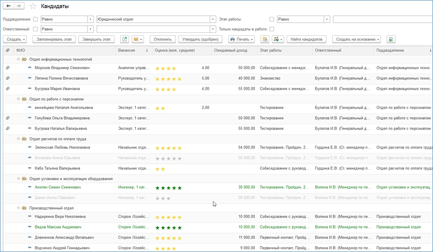 Можно изменять список кнопкой «Еще–Настроить список». Тут можно добавить отбор, установить порядок сортировки, а также изменить группировку кандидатов (например, на рисунке выше добавлена группировка «Подразделение», в результате видим список с разбивкой по отделам). Состав столбцов меняется по кнопке «Еще–Изменить форму».