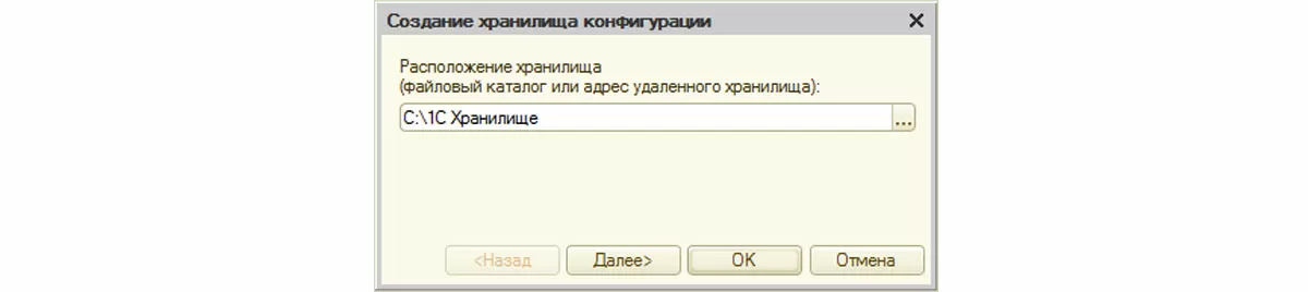 Указываем путь, где будет располагаться хранилище. Это может быть локальный компьютер, компьютер в сети, сервере или веб-сервере. Пример локального пути – С:\1С Хранилище.